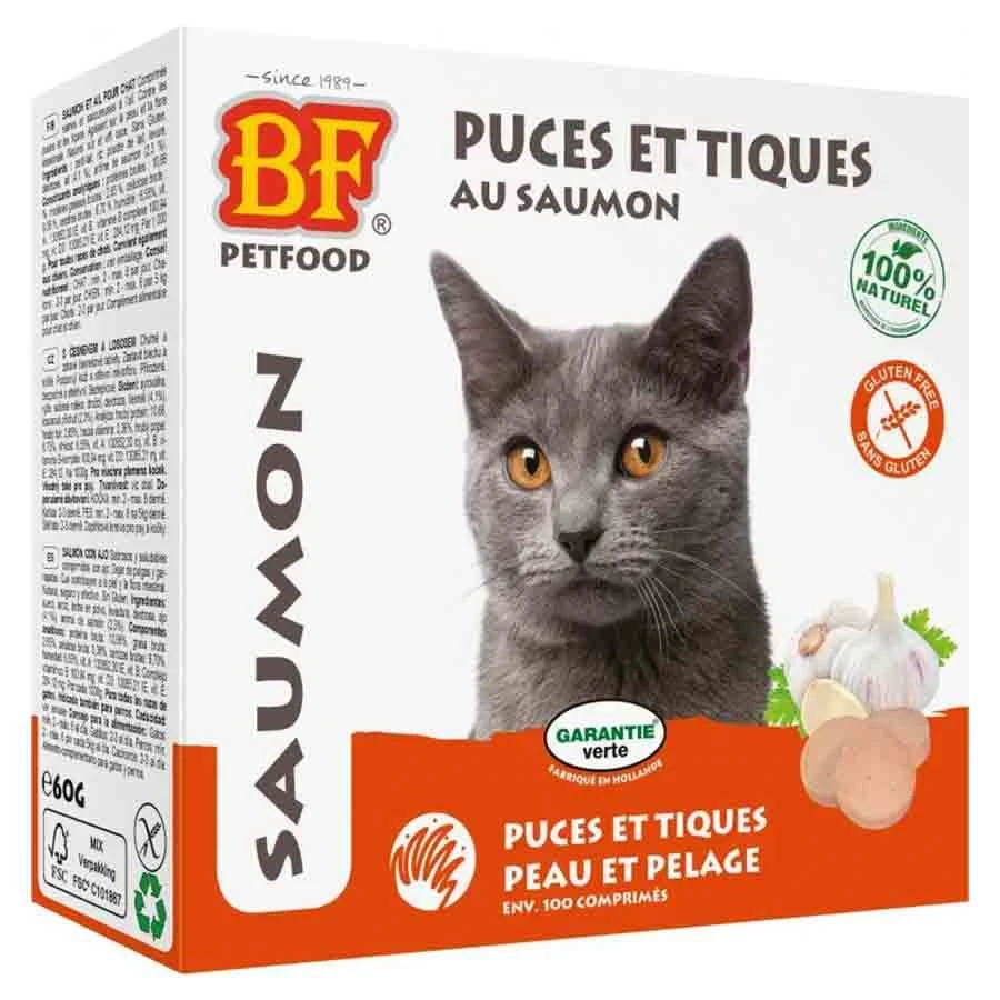 Les comprimés anti puces et tiques au saumon de chez Biofood sont à base de petit-lait, de riz et de levure de bière pour un effet antiparasitaire.