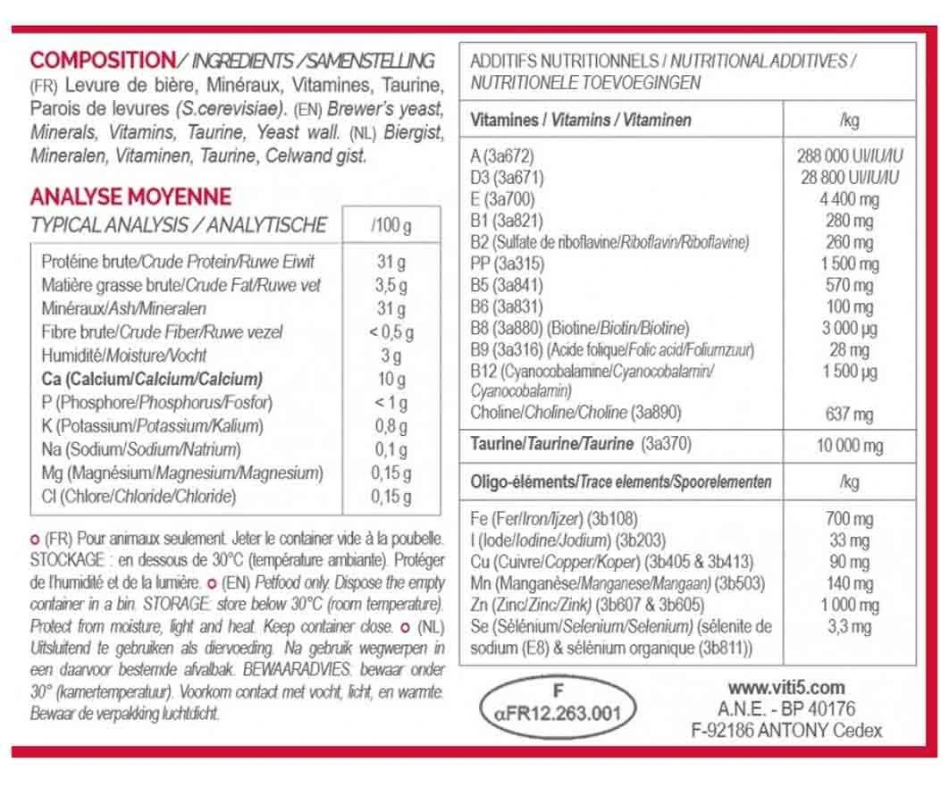 VIT’I5 Rouge poudre chat et chien est un complément alimentaire pour chats et chiens afin d’équilibrer la ration ménagère. Formulé par un vétérinaire nutritionniste pour équilibrer en minéraux, vitamines et oligo-éléments l’alimentation mixte des chiens et chats.